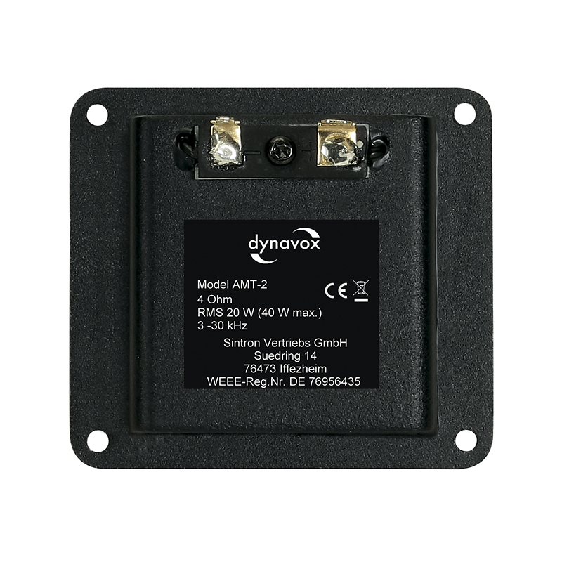 Der Dynavox AMT-2 Air Motion Transformer ist ein Highend-Hochtöner und mit den typischen Eigenschaften dieses speziellen Lautsprechertyps: hochdynamisches Klangbild, exzellentes Impulsverhalten, hoher Wirkungsgrad und geringe harmonische Verzerrungen. Massive, schwarze 3 mm Aluminium Frontblende, Hochleistungs-Neodym-Magnetsystem, Gefaltete Membran aus Kapton und Aluminiumfolie.