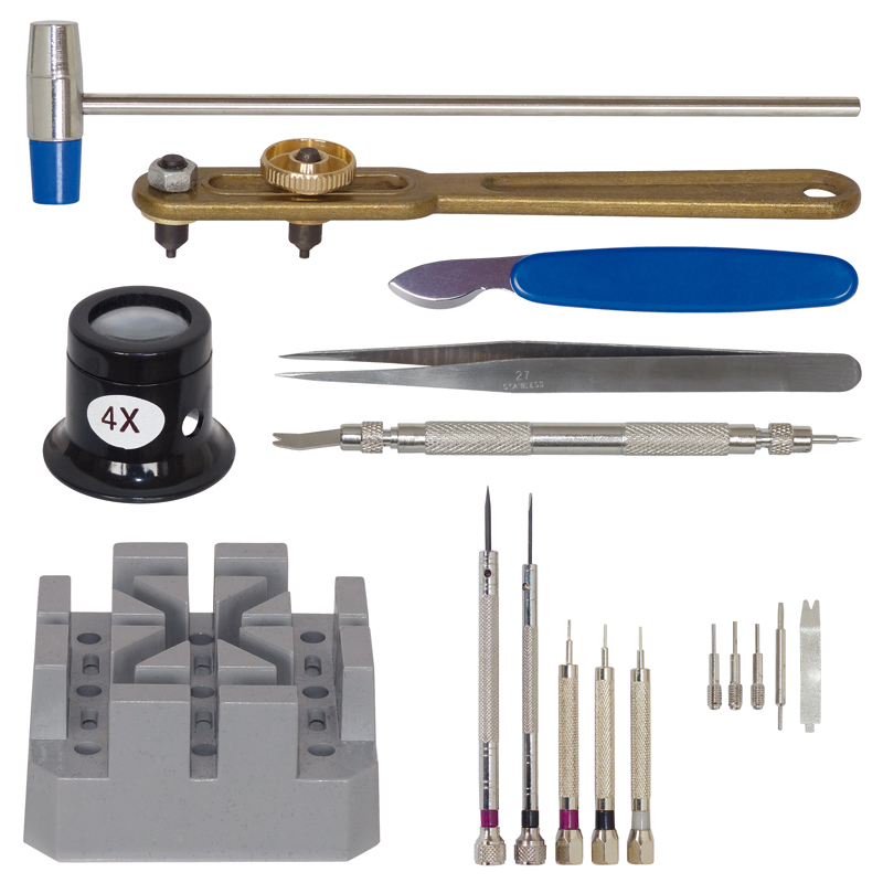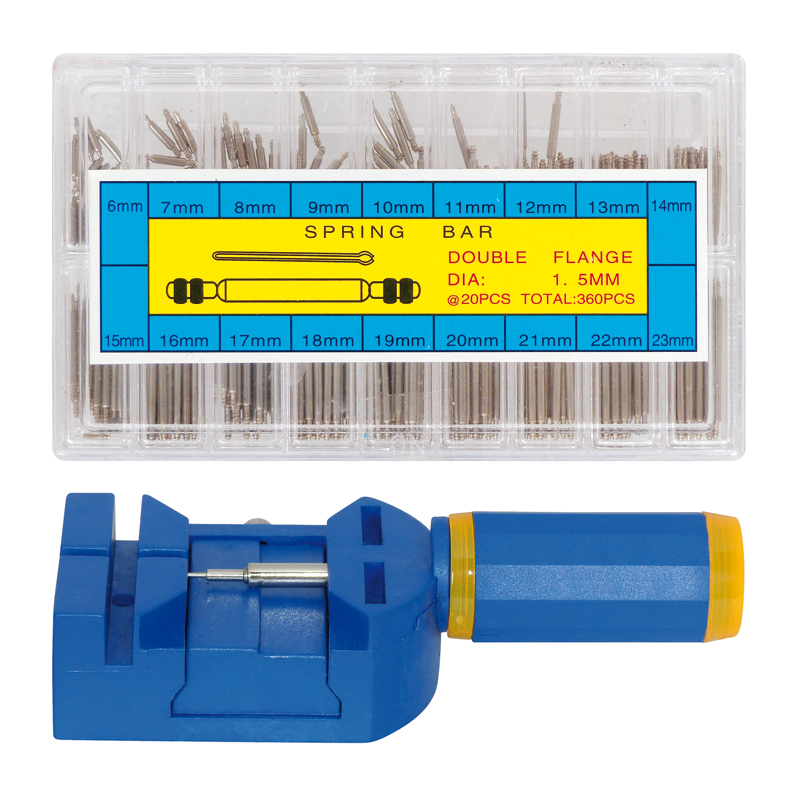 Professionelles 378-teiliges Uhrenwerkzeugset in Kunststoffbox für die Reparatur und Wartung von Armbanduhren. Set inklusive 1 Sprungdeckelöffner, 1 Gehäusebodenöffner für verschraubte Uhrendeckel, 1 Stiftausdrücker aus Kunststoff (inkl. 3 Ersatzstiften), 1 Gehäusehalter aus Kunststoff mit 3 Metallstiftausdrückern, 1 antimagnetische Pinzette, 1 Federstegbesteck (inkl. 2 Ersatzfederaufnahmen), 1 Uhrmacherokular, 1 360-teiliges Federstegset für Uhrenarmbänder (Praktische Sortierbox mit den gebräuchlichsten Federstegen für Uhrenarmbänder, Längen von 6 - 23 mm. 360 Stück sortiert, jeweils 20 Stück jeder Größe, Durchmesser 1,5 mm.), 1 Uhrmacherhammer, 2 Uhrmacherschraubendreher.